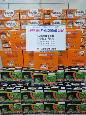 [남도저널 봉현구 기자] 상동에 위치한 새목포제일교회가 상동의 형편이 어려운 이웃을 위해 라면과 두유를 각 52박스를 지난 10일 상동행정복지센터에 기탁했다.
