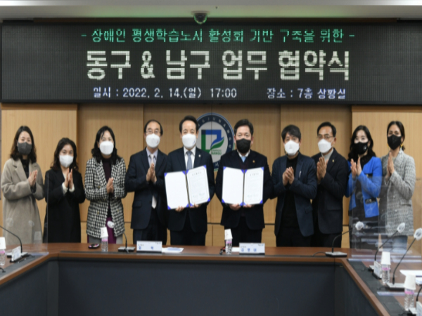 15일 남구에 따르면 지난 14일 오후 5시 남구청 7층 구청장실에서 김병내 구청장과 임택 동구청장 등 양 기관 관계자들이 참석한 가운데 장애인 평생학습도시 활성화 기반 구축을 위한 업무협약식이 열렸다.