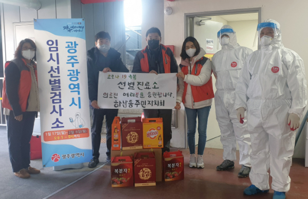 [남도저널 김용범 기자] 광산구 하남동 주민자치회가 지난 17일 하남3지구 주차타워에 설치된 임시 선별진료소를 방문하여 추위에 고생하는 의료진, 현장종사자에게 감사와 응원의 마음을 담아 핫팩과 피로회복음료 등을 전달하였다.