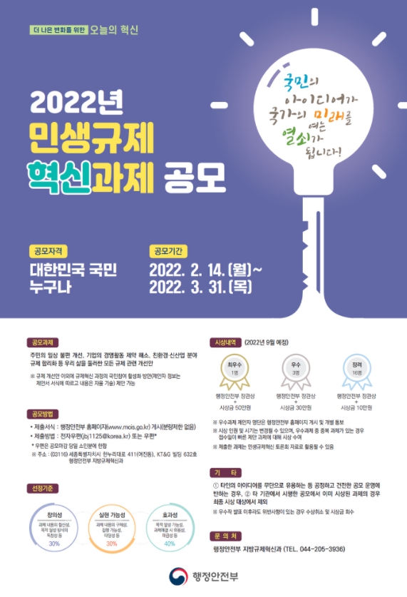 이번 공모전은 시민의 일상생활이나 기업의 경영활동에 불편을 주는 불합리한 규제를 발굴하고 해소하기 위해 ‘국민의 아이디어가 국가의 미래를 여는 열쇠가 됩니다’는 주제로 오는 3월 31일까지 진행된다.