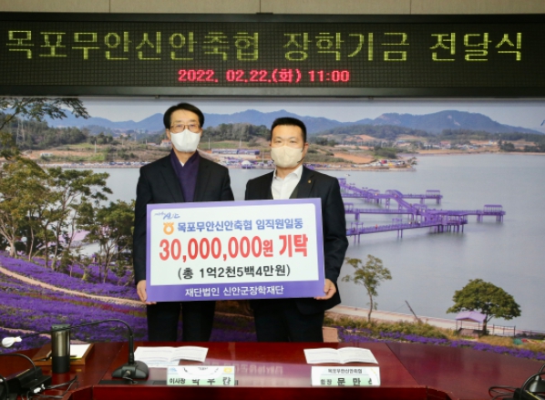 목포무안신안축협은 무안군 무안읍에 본점을 두고 있으며 2016년부터 올해까지 7년간 총 1억2천5백4만원을 신안군장학재단에 기탁했다. 매년 어려운 이웃 돕기 등 지역사회 기부문화 조성에 꾸준하게 앞장서 온 지역 축협이다.