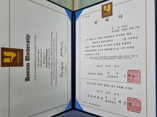 한편, 이로써 장성군청은 유두석 장성군수를 필두로 정양기 실장과 농업기술센터 박언정 원예소득과장(원예학) 3명의 박사학위 소지자를 보유하게 됐다.