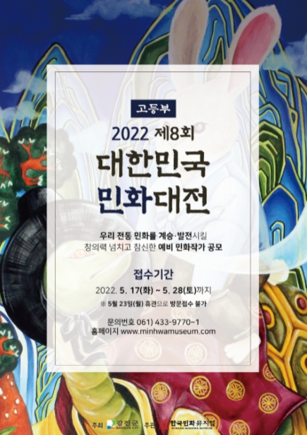 [남도저널 양용숙] 국내 최대 규모의 민화 전문 공립 박물관인 강진군 대구면 소재 한국민화뮤지엄에서 《제8회 대한민국민화대전》 참가작품을 공모한다. 해당 공모전은 전통 문화유산인 민화의 계승·발전과 세계화를 위해 강진군 주최, 전라남도와 전라남도교육청, 전라남도강진교육지원청 후원, 한국민화뮤지엄 주관으로 열리는 전국 최대 규모의 민화 공모전으로 학생부(초·중등부/고등부), 일반부로 나뉘어 개최된다.