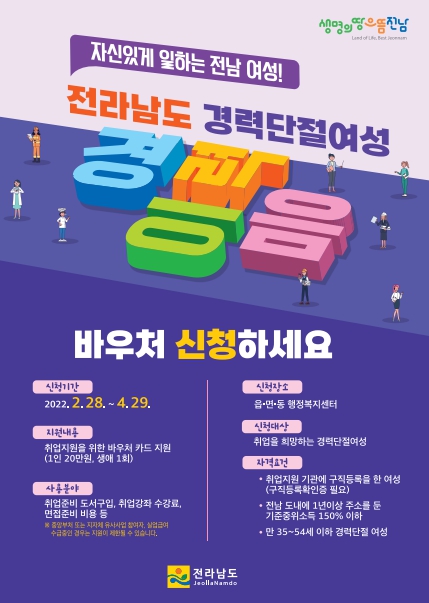 신청자격은 취업지원기관(여성새로일하기센터, 고용복지플러스센터 등)에 구직을 등록한 만 35세~54세(1968.1.1.~1987.1.31.) 경력단절여성이며 신청일 기준 전라남도에 주민등록상 주소지가 1년 이상, 중위소득 150% 이하이면 누구나 신청 가능하다.