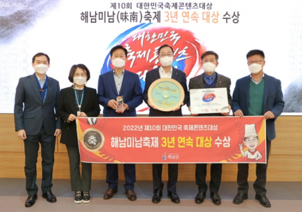 [남도저널 김승귀 기자] 해남군의 대표 먹거리 축제인 해남미남축제가 2022년 제10회 대한민국축제콘텐츠대상을 수상했다. 해남미남축제는 2020년 축제프로그램 연출 우수부문 대상, 2021년 비대면축제 부문 대상에 이어 올해 축제콘텐츠 부문 대상을 수상하며, 3년 연속 대상 수상의 영예를 안았다.