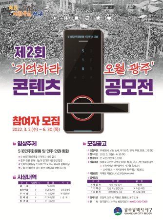 [남도저널 김용범 기자] 광주 서구가 올해로 제42주년을 맞는 5·18 민주화운동 기념하여 전 국민의 관심을 유도하고 공감대 형성을 위해 제2회‘기억하라 오월 광주’콘텐츠 공모전을 추진한다고 밝혔다.
