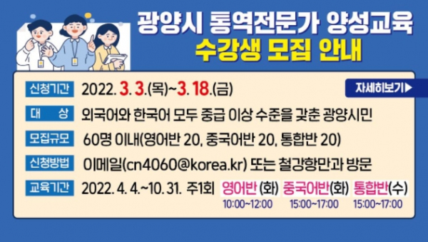 [남도저널 김영도 기자] 광양시는 시와 민간차원의 각종 국제교류에 필요한 통역 정예 요원을 양성하기 위해 외국어와 한국어 모두 중급 이상의 실력을 갖춘 시민(다문화가정 포함)을 대상으로 3월 3~18일(16일간) ‘광양시 국제교류 통역전문가 양성교육’ 수강생을 모집한다.
