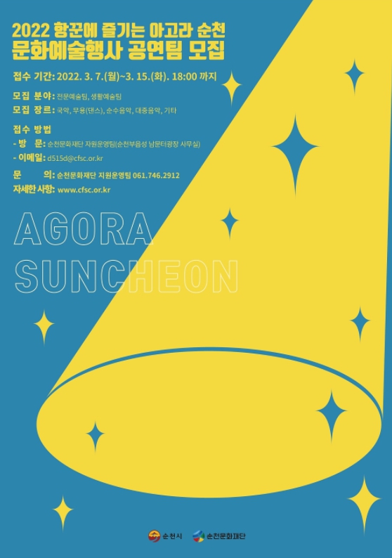 [남도저널 김영도 기자] 순천문화재단은 지역 문화예술인들의 활동기반 강화와 시민 문화향유 기회 확대를 위한 ‘2022 항꾼에 즐기는 아고라 순천’공연팀을 공개 모집한다.