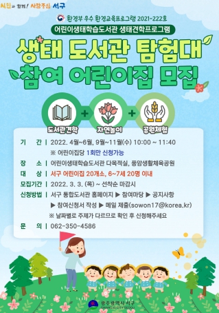 [남도저널 김용범 기자] 광주 서구 어린이생태학습도서관이‘생태 도서관 탐험대’에 참여할 서구 관내 어린이집 20개소를 모집한다.