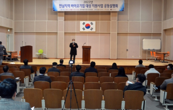 [남도저널 양용숙] (재)전남바이오산업진흥원 천연자원연구센터, 국립호남권생물자원관, 장흥군버섯산업연구원 3개 기관은 지난 2월 28일 장흥의 천연자원연구센터 대강당에서 '2022년도 전남지역 바이오기업 대상 지원사업 공동설명회'를 개최했다.
