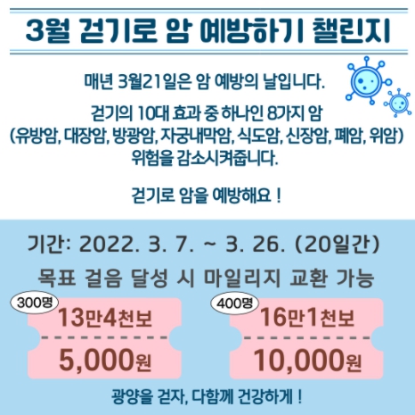 3월 7~26일(20일간) 진행되는 걷기 챌린지는 1걸음당 1마일리지 적립으로 1일 최대 9천 마일리지가 누적되며, 본인의 걷기 활동량에 따라 단계별 쿠폰 교환이 가능하다.