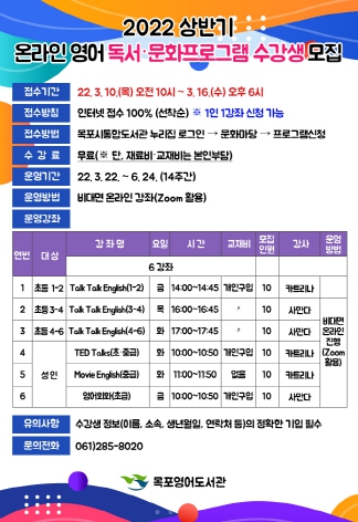 [남도저널 봉현구 기자] 목포영어도서관이 오는 3월 22일부터 6월 24일까지 목포시와 인근지역의 초등학생과 성인을 대상으로 온라인 영어 독서·문화프로그램을 운영한다.