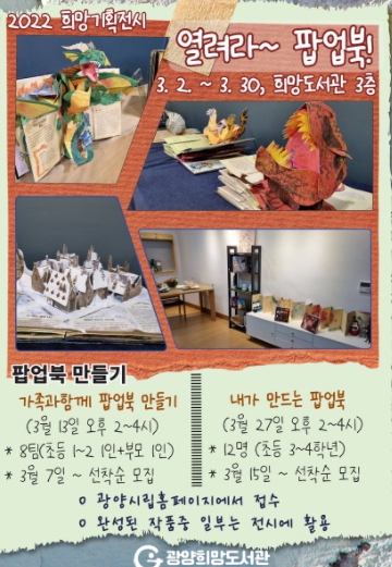 김현숙 희망도서관팀장은 “팝업북 전시가 책을 단순히 읽는 것을 넘어, 보고 만지는 즐거움을 통해 아이들에게 독서에 대한 흥미를 높이고, 호기심과 상상력을 길러줄 것으로 기대한다”며, “시민 여러분의 많은 관람을 부탁드린다”고 말했다.