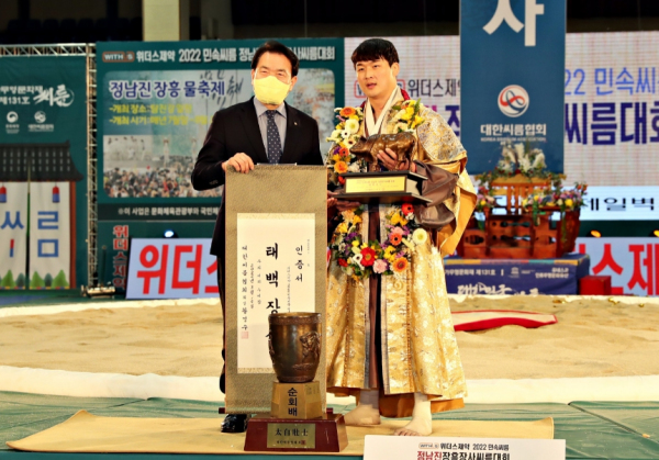 14일 펼쳐진 태백장사 결정전에는 장흥군 관산읍 출신 문준석(31, 수원특례시청)이 우승 트로피를 들어올렸다.