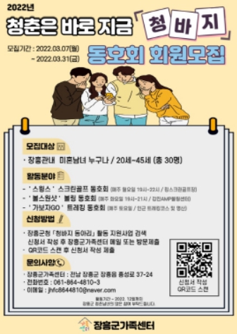 자세한 사항은 장흥군 홈페이지, 장흥군 청년센터에서 ‘청바지’ 동아리 검색 또는 장흥군 가족센터에 문의하면 된다.
