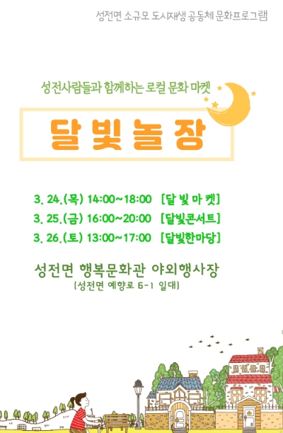 24일 오후 2시 성전면민들이 직접 난타공연을 선보이는 개막행사를 시작으로 1일차에는 지역 농산물‧공예품 마켓, 어린이 벼룩시장, 타로운세 등 행사가 진행되며, 2일차에는 피아노, 해금, 보컬공연 등 달빛콘서트, 3일차에는 성전 주민이 하나되는 노래자랑, 댄스공연, 영화상영 등 성전한마당 행사가 진행된다.