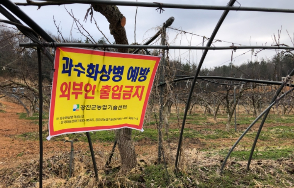 군은 지난 1월부터 사과 및 배 과수원을 위주로 동계 예찰을 실시하고 있으며, 2월부터는 과수화상병 1차 방제약제를 관내 사과 및 배 재배농가에게 배부하고 방제교육을 실시한 바 있다.