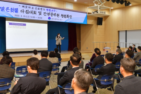 [남도저널 김용범 기자] 광주 서구가 지난 25일 5급(부서장) 이상 간부공무원 60여명을 대상으로 공직사회에 흐르는 청렴물길 조성을 위해 ‘맑은 윗물 다짐대회와 이해충돌방지법 청렴특강’을 실시했다고 밝혔다.