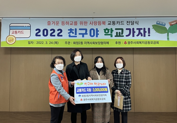 [남도저널 김용범 기자] 광주 서구 화정2동 보장협의체가 지난 24일 저소득 세대 자녀들의 등하굣길 교통비 지원을 위해 '친구야 학교가자!' 사업을 추진하면서 10만원 상당의 교통카드 30장(300만원 상당)을 지원하여 훈훈함을 더하고 있다.
