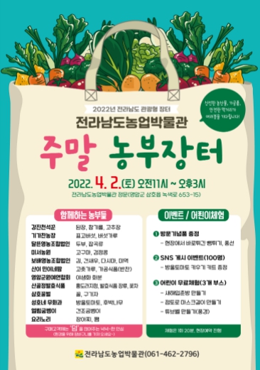 [남도저널 조기훈 기자] 전라남도농업박물관이 지역 주민과의 친화 및 관광객 유치를 위해 추진하는 ‘관광형 주말 농부장터’가 4월 2일 올 들어 처음 개장한다.