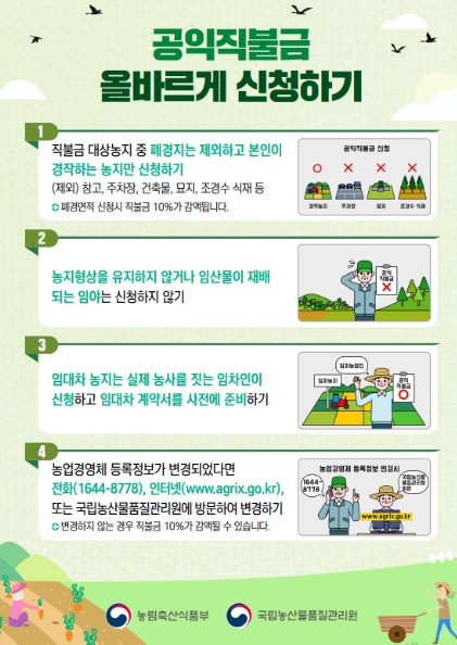 공익직불금은 실제 경작자에게 지급되는 보조금으로 본인이 직접 경작하고 있는 농지에 대해서만 신청해야 한다. 묘지, 건축물 부지, 주차장, 정원 등 농업에 이용되지 않는 면적은 제외해야 하며, 폐경면적을 포함해 신청할 경우 직불금 10%가 감액된다.