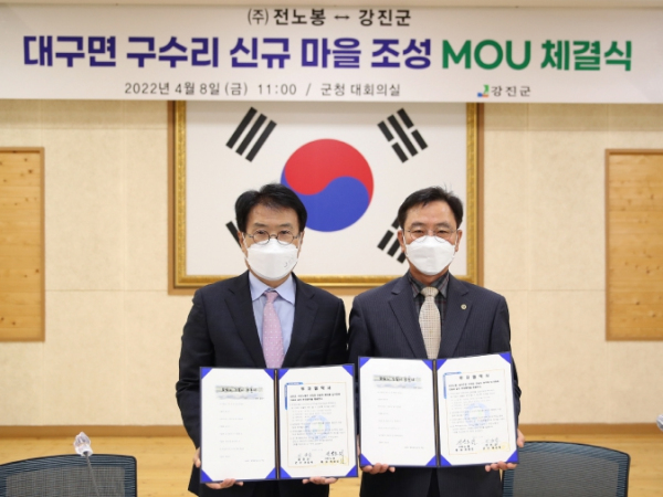 [남도저널 양용숙] 지난 8일 강진군과 ㈜전노봉이 대구면 구수리 신규마을 조성 주택단지 건립을 위한 투자 양해 각서(MOU)를 체결했다.