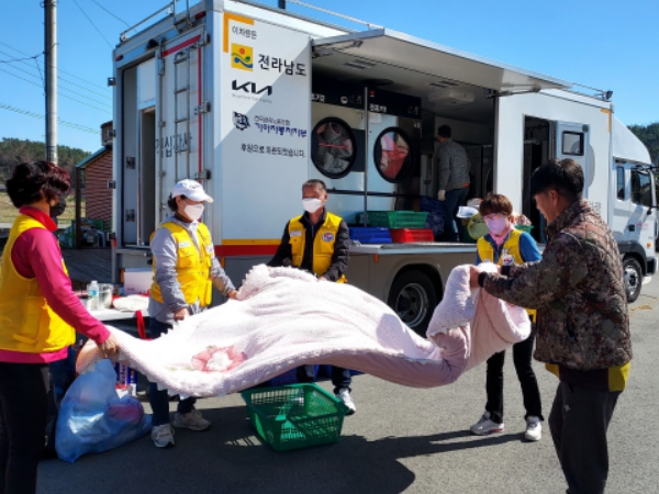 의신면 적십자봉사회 자원봉사자 20여명이 의신면 거룡마을 경로당 앞에서 이동 세탁 차량을 이용, 거동이 불편한 독거노인과 장애인 등 40여 가구를 방문해 이불 450kg을 수거, 세탁·건조 후 각 가정으로 배달했다.