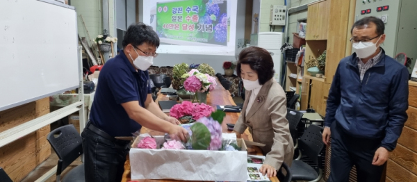[남도저널 양용숙] 유미자 강진군수 권한대행은 지난 25일 관내 절화수국 재배 법인인 그린화훼영농법인(대표 김양석)을 찾아가 격려하고 화훼 직거래를 통한 위기 극복 방안에 대해 협의했다.
