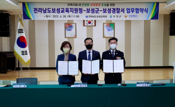 [남도저널 서인호 기자] 보성군과 보성교육지원청, 보성경찰서는 지난 28일 보성교육지원청에서 안전한 교육 환경 조성을 위한 업무협약을 체결했다.