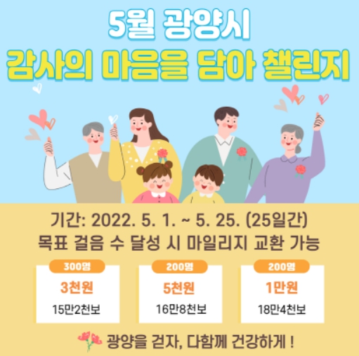 [남도저널 김영도 기자] 광양시가 걷기를 통해 건강한 지역사회 분위기를 조성하고자 일상 속 건강걷기실천 모바일 걷기앱 워크온 ‘5월 감사의 마음을 담아, 걷기 챌린지’를 운영한다.