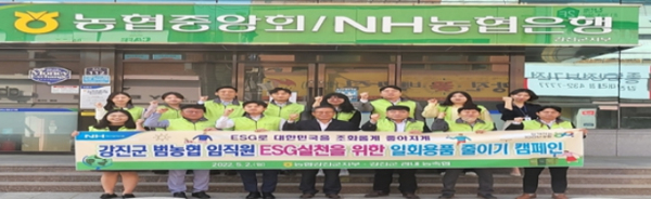 이번 캠페인은 일회용품과 플라스틱의 무분별한 사용을 줄여 환경을 보호에 앞장서고, 제50회 강진군민의 날 기념행사를 맞아 농협강진군지부 인근 주변 담배꽁초와 쓰레기를 줍는 일명'줍깅'운동으로 실시했으며,‘ESG로 대한민국을’,‘조화롭게 좋아지게’의 힘찬 구호를 외치면서 이날 행사를 마무리 하였다,