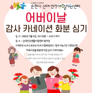 신대건강생활지원센터 앞마당에서 이뤄지는 이번 행사는 바르게살기운동 해룡면위원회, 두루미마을학교와 연계하여 선착순 200가정을 대상으로 부모와 자녀가 카네이션을 함께 화분에 심으며 어버이의 은혜를 되새기는 시간을 가질 예정이다.