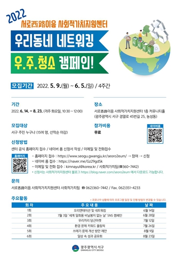 신청마감 다음 주인 6월 14일부터 8월 23일까지 매 격주 화요일마다 ‘우주청소 캠페인’을 주제로 ▲ 내가 사는 우리동네 키워드 소개하기 ▲ 7월 3일 ‘세계 일회용 비닐봉지 없는 날’ SNS 캠페인, ▲ 우리끼리 당근마켓 ▲ 환경 문제 키워드 올림픽 ▲ 쓰레기 문제 개선 방안 제안 ▲ 일상 속 성과 공유회 등 총 6회로 구성·운영할 계획이다.