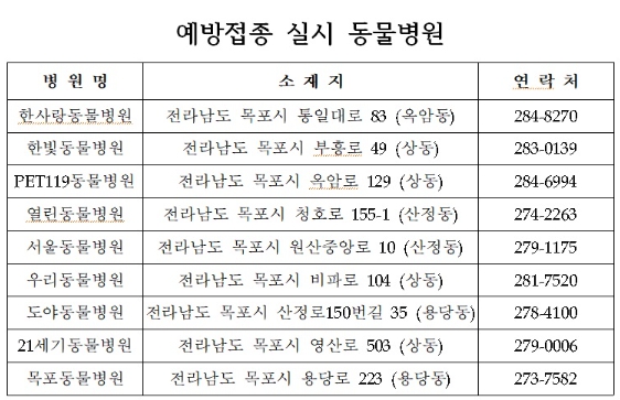 [남도저널 봉현구 기자] 목포시가 바이러스성 인수공통 전염병인 광견병 발생을 예방하기 위해 오는 10일부터 20일까지 관내 9개 동물병원에서 예방접종을 실시한다.