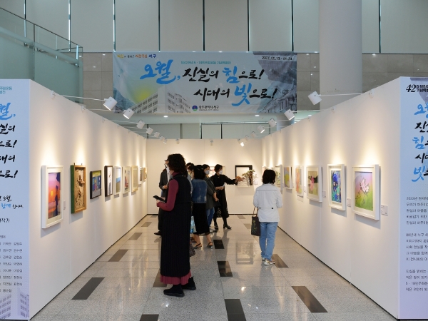 오는 24일까지는 청사 1층 로비에 5·18 당시의 아픔을 예술로 승화시킨 순수미술 작품 등을 만날 수 있는‘80년 5월, 오늘도 우리는 함께 합니다. 특별전’을 마련하여 서구미술협회 작가 등 30여 명의 회화와 조각 작품을 전시한다.