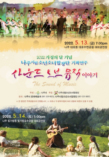 전라남도 나주시는 가정의 달 5월을 맞아 13~14일 양일 간 시민의 문화 향유와 가정 행복을 기원하는 ‘사운드 오브 뮤직’ 공연을 개최한다고 10일 밝혔다.