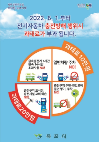 [남도저널 봉현구 기자] 목포시가 오는 6월 1일부터 모든 전기차 충전구역 및 전용주차구역 내에서의 불법주차 등 충전방해 행위에 대해 10만원에서 최대 20만원까지 과태료를 부과한다.