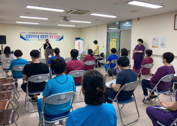 이번 컨설팅은 코로나19 확진자가 집단으로 발생한 3개소에 대해 방역수칙 준수 사항과 감염관리 실태를 점검하고 미흡한 부분에 대해서는 현장 지도를 통해 보완조치토록 하였으며, 환자 발생 시 접촉자 분류, 감염관리, 환경관리 등 관리자 및 종사자에 대한 감염병 대응 역량 강화 교육도 함께 진행되었다.