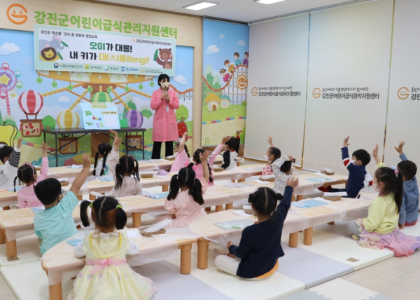 [남도저널 양용숙] 강진군 어린이급식관리지원센터는 지난 5월 9일부터 11일까지 관내 어린이집 5개소 만 3~5세 어린이 58명을 대상으로 ‘오이가 대롱! 내 키가 대(大)롱!’ 주제로 영양 교육을 실시했다.