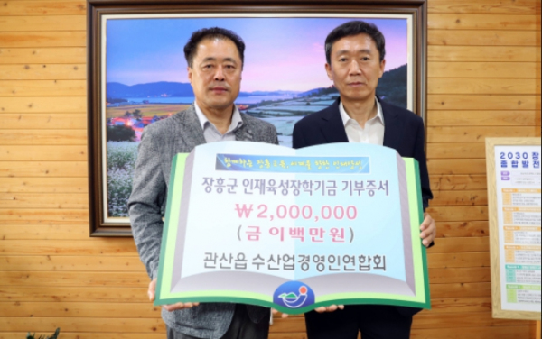 [남도저널 양용숙] 장흥군 수산업경영인 관산연합회(회장 백임표)는 19일 미래의 꿈나무 육성을 위해 장흥군인재육성장학회에 장학금 200만원을 기부했다.