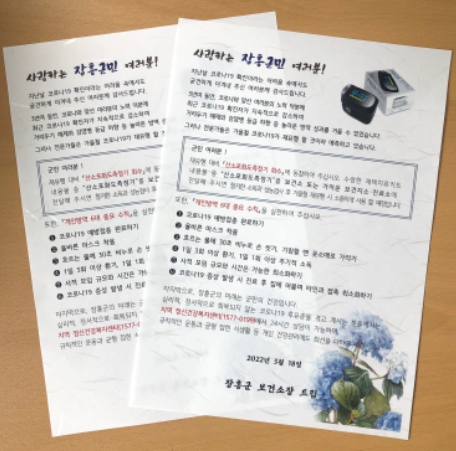 장흥군이 보낸 서한문에는 재택치료 해제자의 안부와 향후 코로나19 재유행에 대비하기 위해 산소포화도 측정기 회수에 적극 동참해주라는 메시지가 담겨져 있다.