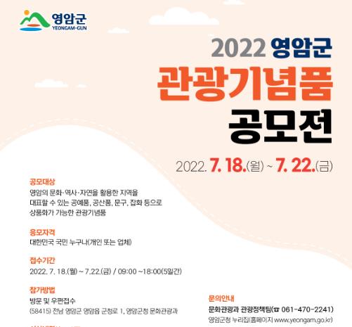 [남도저널 김승귀 기자] 전라남도 영암군은 지역의 특색있고 실용적인 우수 관광기념품을 발굴하기 위하여 '2022 영암군 관광기념품 공모전'을 개최한다.