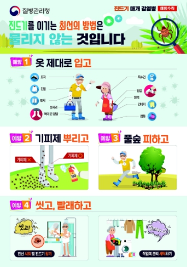 대표적인 진드기 매개 감염병인 쯔쯔가무시병과 중증열성혈소판감소증후군은 보통 4∼11월 바이러스와 세균을 보유한 진드기에 의해 발병하고, 물린 후 1∼2주이내 고열과 오심, 구토, 설사 등 소화기 증상과 피부발진이 나타나는 감염병으로 영농 및 봄철 야외활동 증가 등 발생위험증가에 반해 특별한 예방 방법이 없어 각별한 주의가 필요한 상황이다.