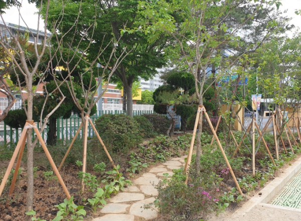 이번 사업을 통해 운동장 사각지대와 낡은 쉼터 등 학생들이 잘 이용하지 않던 삭막한 곳으로, 이곳에 꽃과 유실수를 심어 산책로를 따라 다양한 질감과 색상이 어우러진 정원을 조성하여 녹색공간을 확보했다.