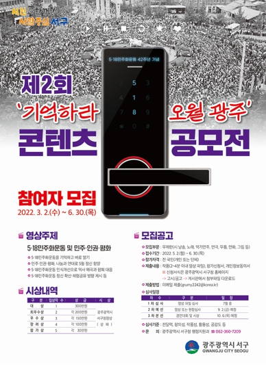 [남도저널 김용범 기자] 광주 서구가 5·18 민주화운동 제42주년을 기념하여 민주․인권․평화를 위한 전 국민 관심 유도 및 공감대 형성을 위한 제2회 ‘기억하라 오월 광주’ 콘텐츠 공모전을 추진한다.