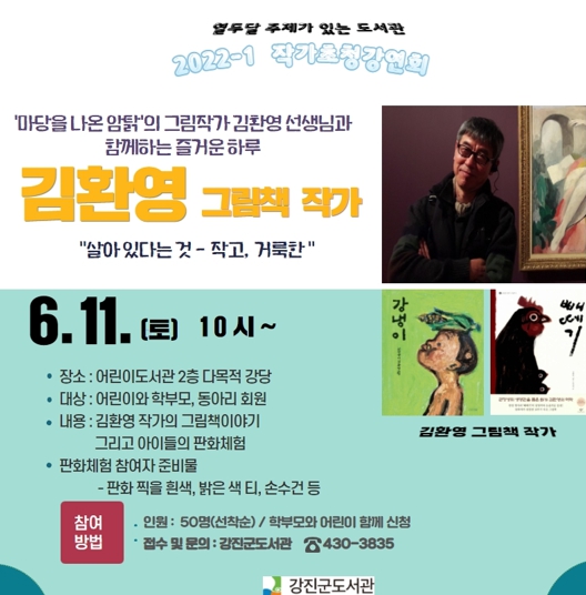 [남도저널 양용숙] 강진군도서관은 6월 11일 오전 10시 강진군 도서관 다목적 강당에서 '마당을 나온 암탉', '강냉이', '빼떼기'의 그림책 작가로 널리 알려진 김환영 작가 초청강연회를 개최한다.