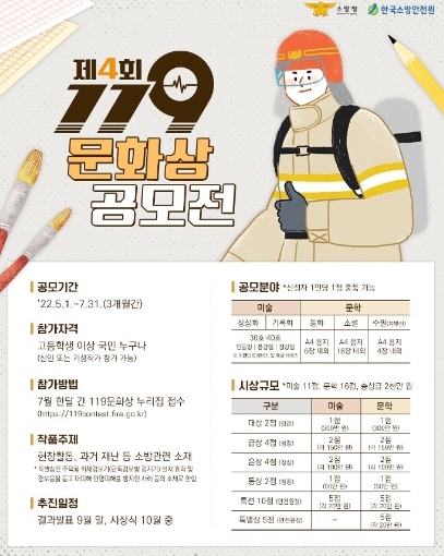[남도저널 봉현구 기자] 목포소방서는 소방청과 한국소방안전원이 공동주최하는 제4회 119문화상 작품 공모를 7월 31일까지 실시한다고 밝혔다.