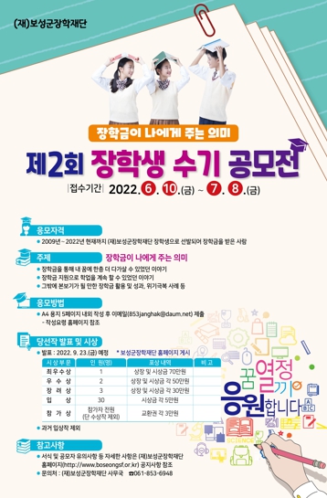 수기 공모 자격은 2009년부터 2022년까지 보성군장학재단을 통해 장학금을 지원받은 적이 있어야 한다.