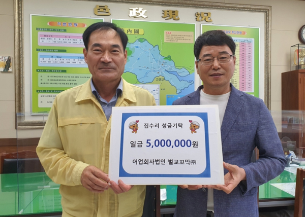 [남도저널 서인호 기자] 14일 어업회사법인 벌교꼬막 서홍석 대표가 보성군 벌교읍행정복지센터를 찾아 성금 5백만 원을 기탁하고 기념사진을 찍고 있다.