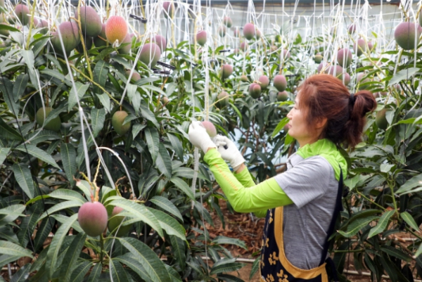 [남도저널 양용숙] 장흥군 용산면 계산마을의 한 농가에서 출하를 앞둔 애플망고에 낙과 방지용 그물망을 씌우고 있다. 프리미엄 과일시장에서도 귀한 대접을 받는 장흥 애플망고는 당도가 높고 향이 좋아 소비자들의 인기를 얻고 있다.